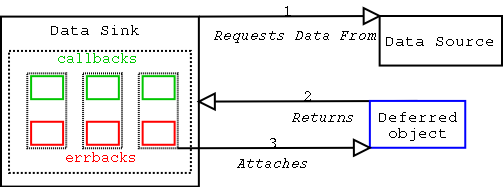 The client application attaches a series of functions to the deferred to be called in order when the results of the asynchronous request are available (this series of functions is known as a series of callbacks, or a callback chain), together with a series of functions to be called if there is an error in the asynchronous request (known as a series of errbacks or an errback chain).